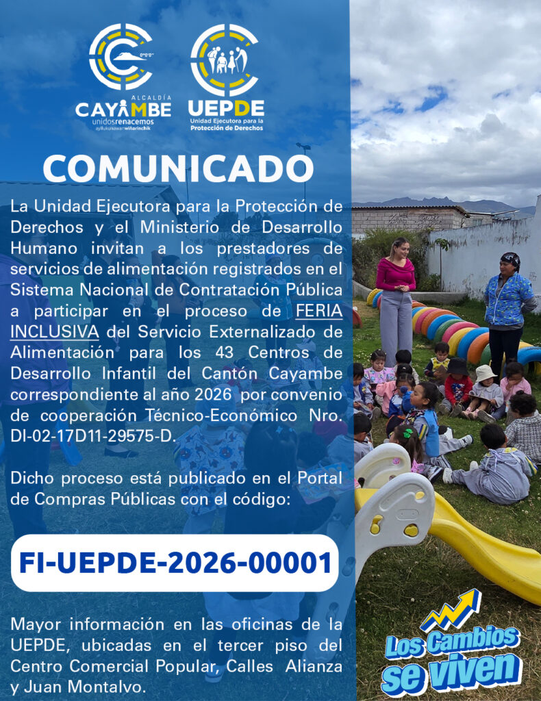 La Alcaldía de Cayambe, a través de la UNIDAD EJECUTORA PARA LA PROTECCIÓN DE DERECHOS CAYAMBE, en cumplimiento de la normativa vigente del Sistema Nacional de Compras Públicas (SNCP) y en concordancia con los principios de transparencia, equidad e inclusión, convoca a los prestadores de servicios de alimentación debidamente registrados y habilitados en el Sistema Nacional de Compras Públicas, a participar en el proceso de FERIA INCLUSIVA.