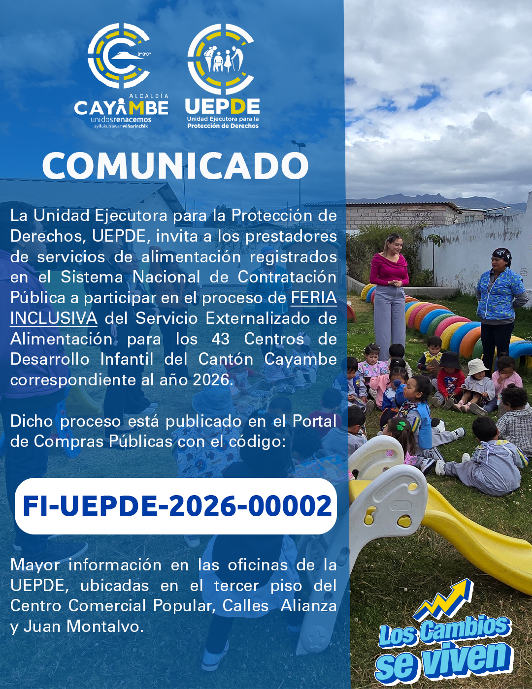 La Unidad Ejecutora para la Protección de Derechos (UEPDE) informa a la ciudadanía y, en especial, a los prestadores de servicios de alimentación registrados en el Sistema Nacional de Contratación Pública, que se encuentra abierto el proceso de Feria Inclusiva para la contratación del servicio externalizado de alimentación, destinado a los 43 Centros de Desarrollo Infantil del cantón Cayambe, correspondiente al año 2026.